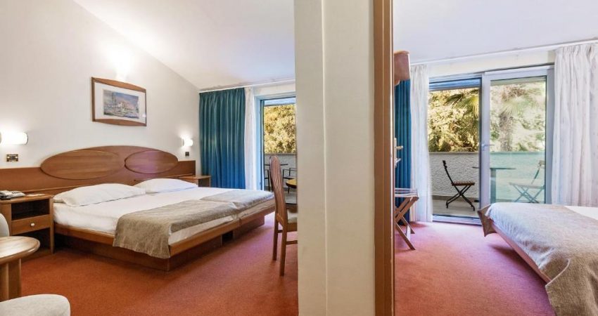 Rodinná izba 4+1 balkón, morská strana - 26-30 m², vhodné pre rodiny s deťmi, orientované na more, 2 samostatné spálne, vaňa, WC, fén, klimatizácia, kúrenie, minibar (za poplatok), trezor (za poplatok), TV (satelitná TV), Wi-Fi, balkón
