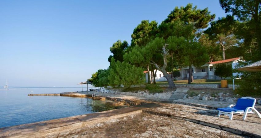 30 m od pláže, 3 km od centra, tiché prostredie. Pláž štrková, trávnatá a kamenistá. Ležadlá (za príplatok), slnečníky  v obmedzenom množstve. Na pláži sprchy, reštaurácia a bary, pláž ocenená modrou vlajkou.